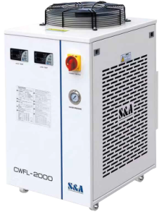 Agua caliente para el cabezal láser y agua fría para la fuente láser, mante niéndolos a temperatura constante para garantizar su funcionamiento normal.
